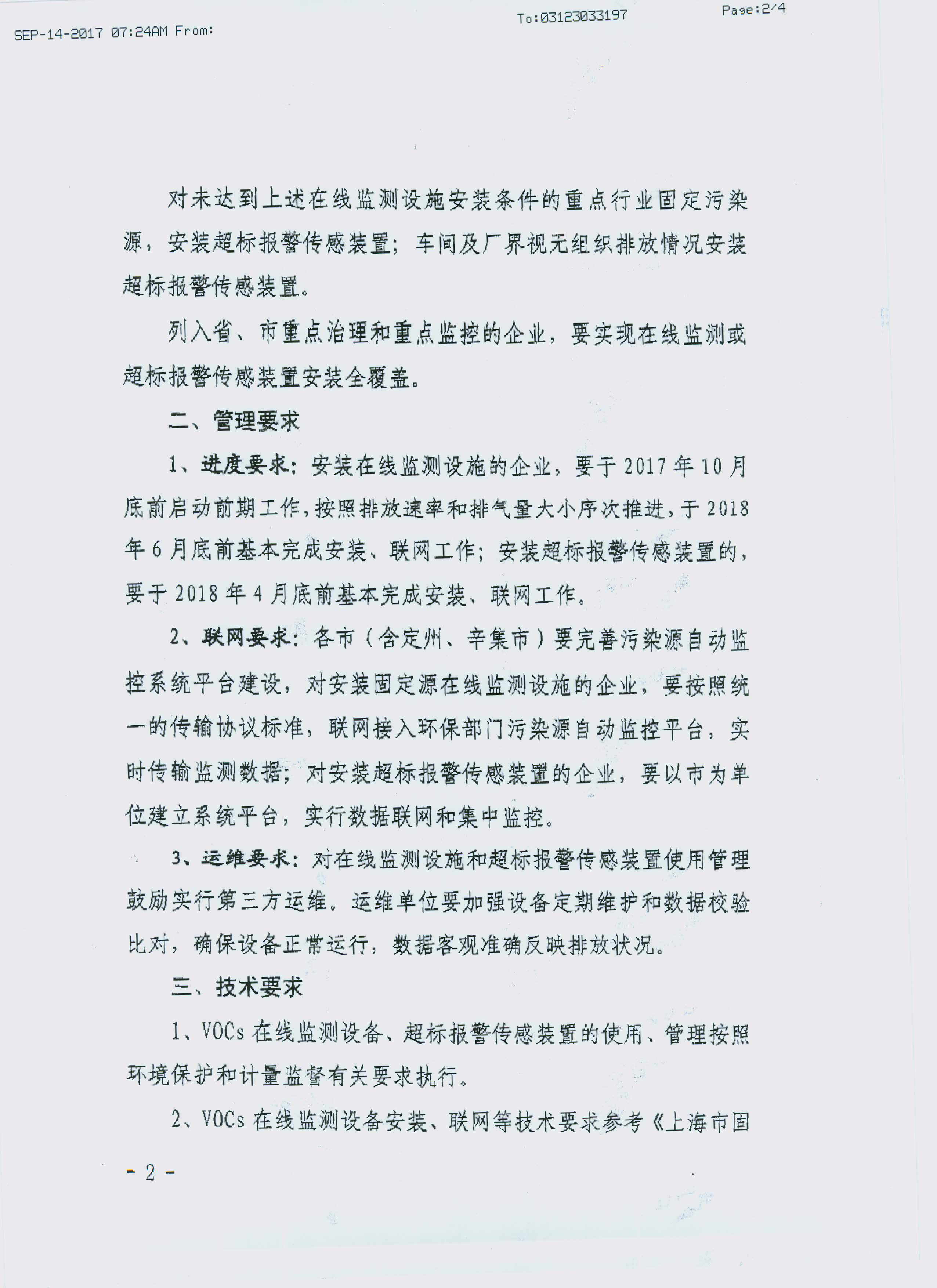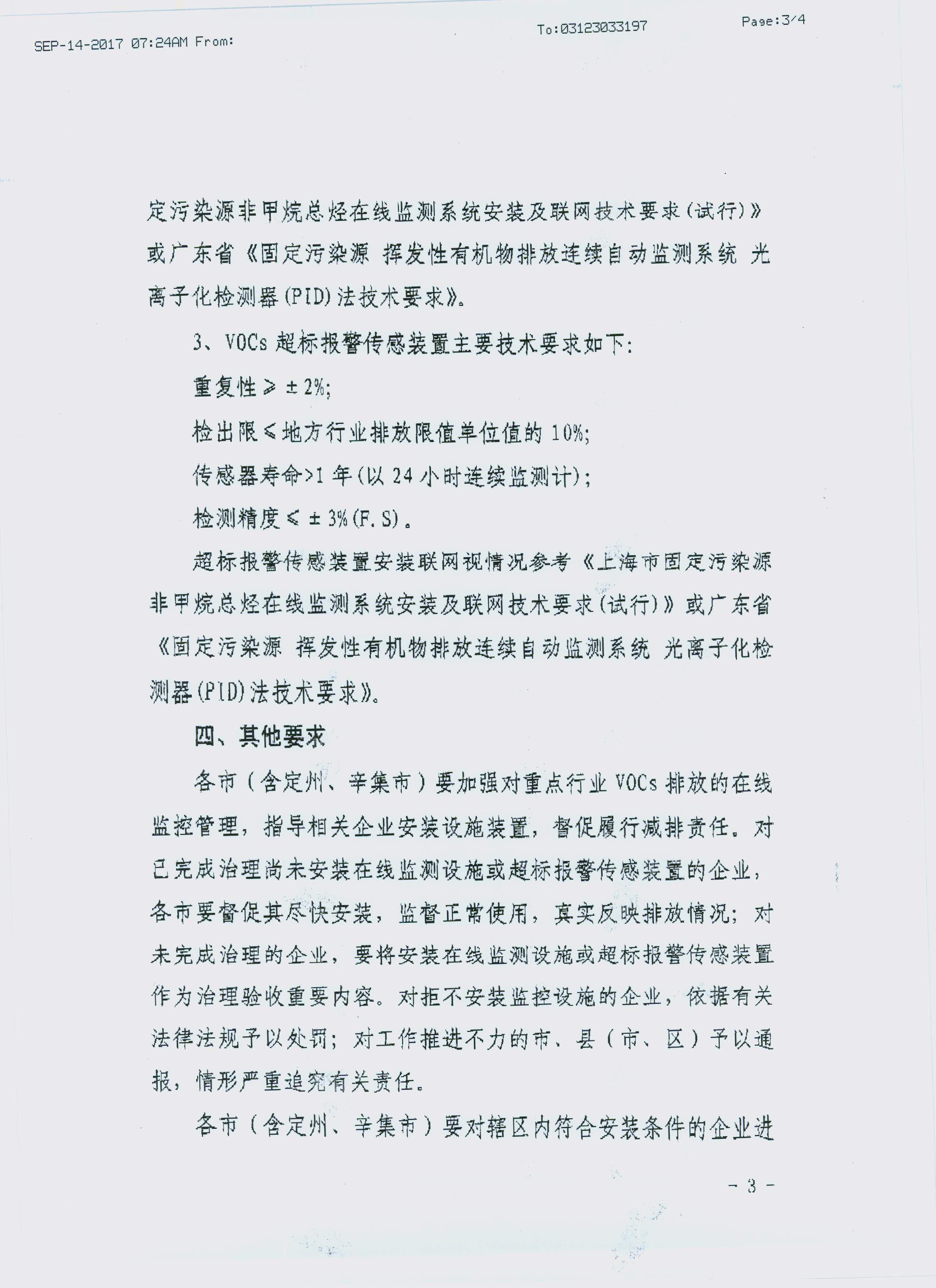 ? ? 為落實《河北省重點行業揮發性有機物污染政治專項實施方案》,加強工業揮發性有機物排放治理設施運行管理,完善監測技術手段,確保達標排放,按照《河北省 2017-2018 年秋冬季大氣污染綜合治理攻堅行動方案》(冀政字【2017】31號)要求,現在重點行業揮發性有機物(VOCs)固定污染源、無組織排放在線監測設施和超標報警傳感裝置安裝使用提出要求。